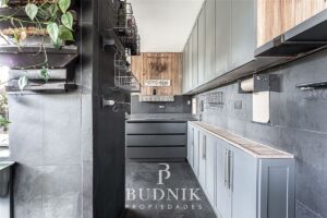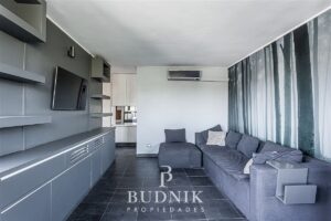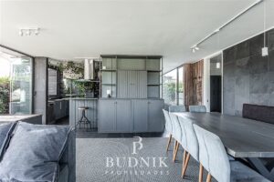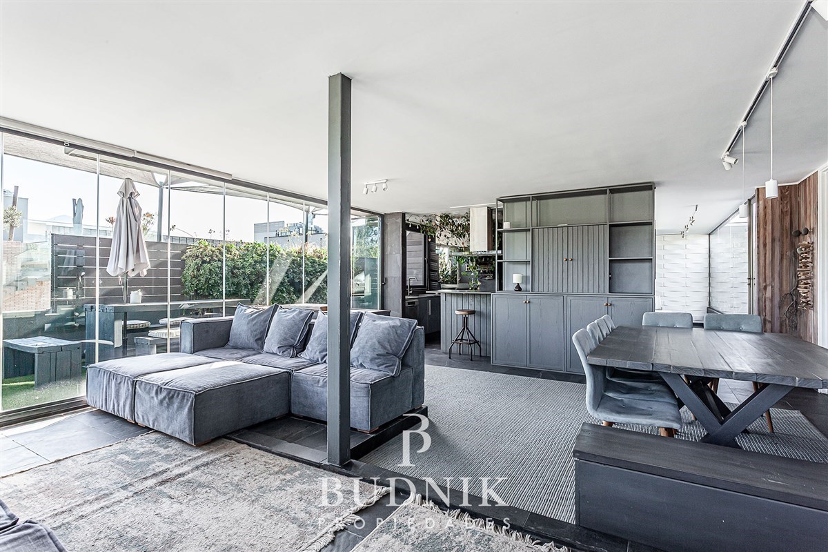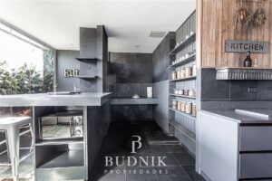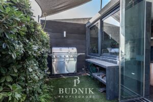 El área social se desarrolla en un ambiente integrado, con cocina moderna abierta, equipada y conectada al living, incorporando sistema de vidrios folding glass que permiten una apertura total hacia la terraza, logrando una integración fluida con el exterior y acceso directo al quincho.